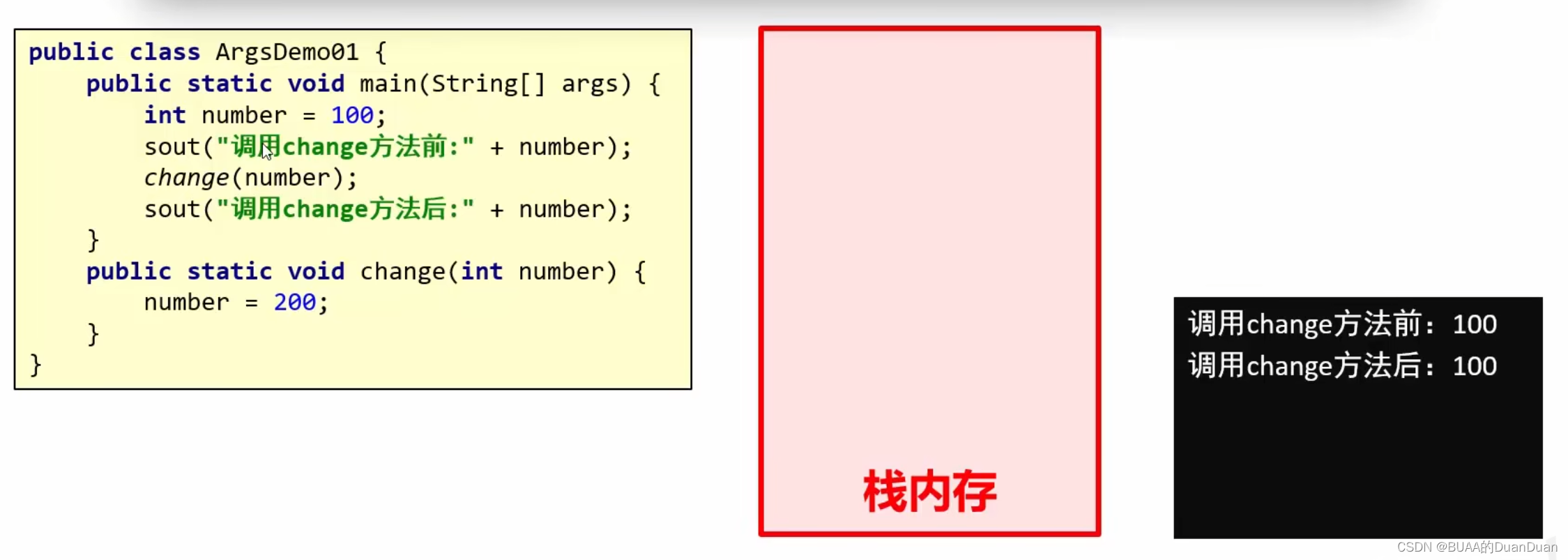 如下例:在chang()方法中,将形参改为200,但在栈中,main方法先进入栈内存,一句一句执行,执行change改变形参后,只是改变了change中number的值,change()方法就出栈,main中number仍为100.