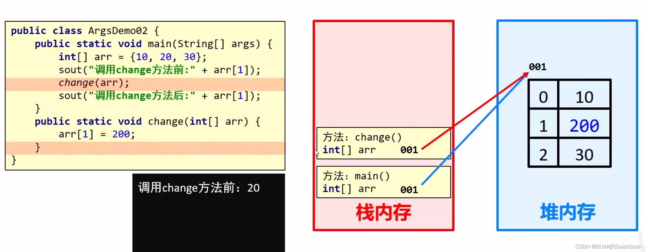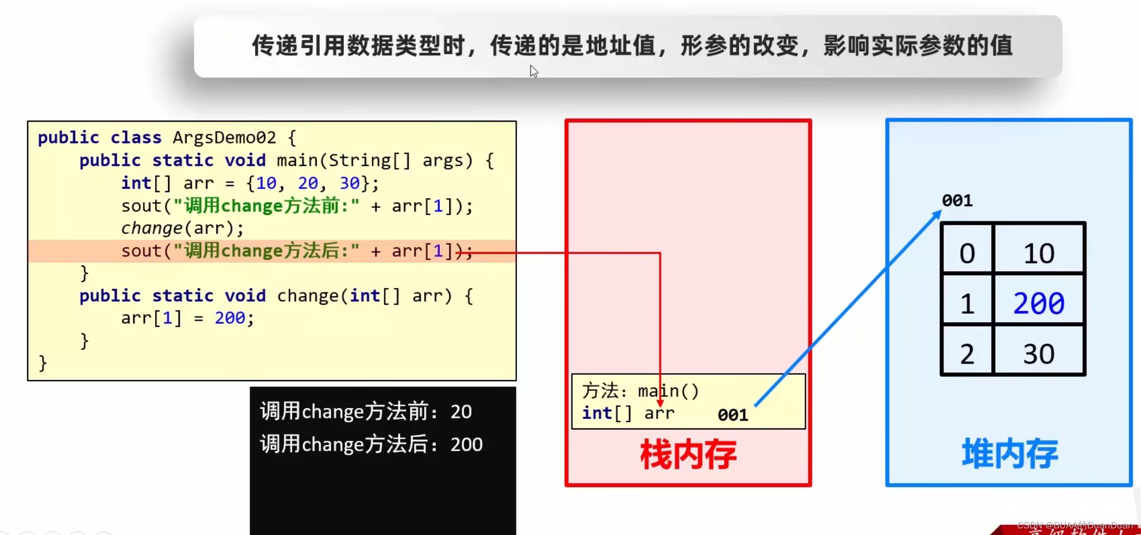 传递引用数据类型时,传递的是地址值,形参的改变,影响实际参数的值