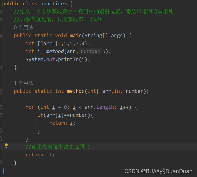 定义一个方法获取数字在数组中的索引位置,将结果返回给调用处,如果有重复的,只要获取第一个即可。