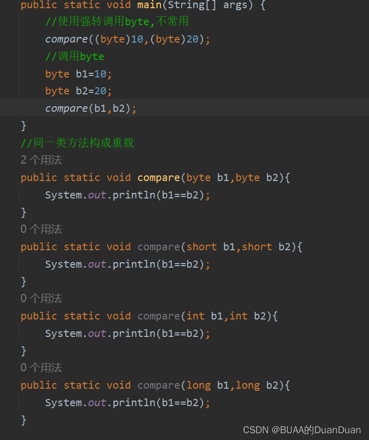 需求:使用方法重载的思想,设计比较两个整数是否相同的方法,兼容全整数类型(byte,short,int,long)