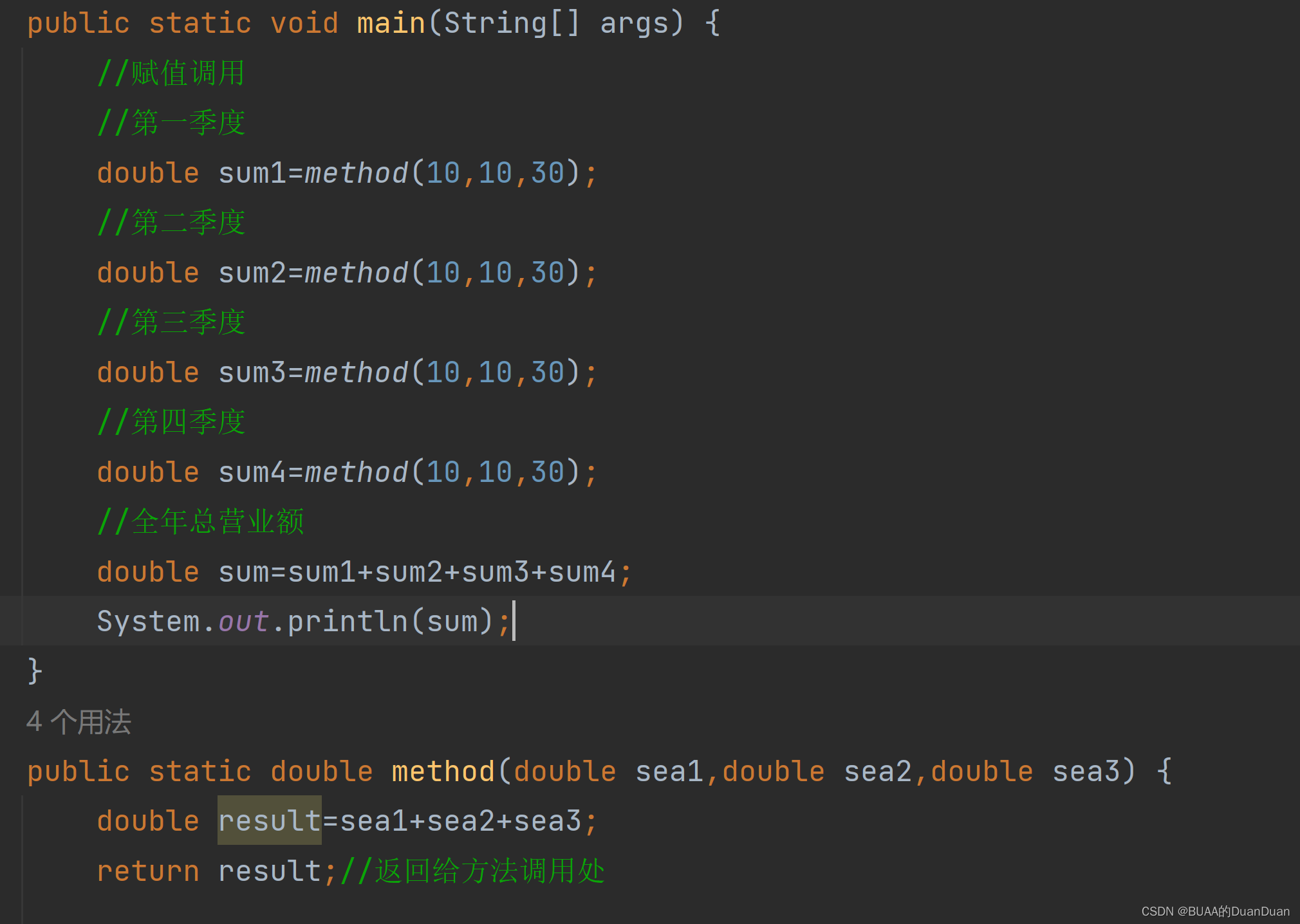 定义一个方法,求一家商场每个季度的营业额。根据方法结果再计算出全年营业额。