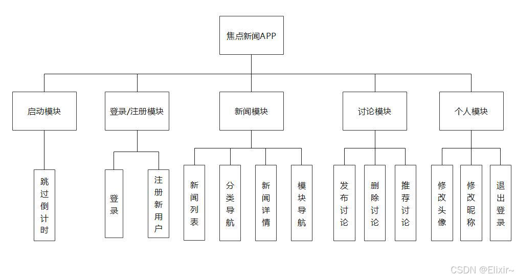系统总共分为五大模块,分别为加载模块、登录注册模块、新闻模块、讨论模块、用户主页模块。