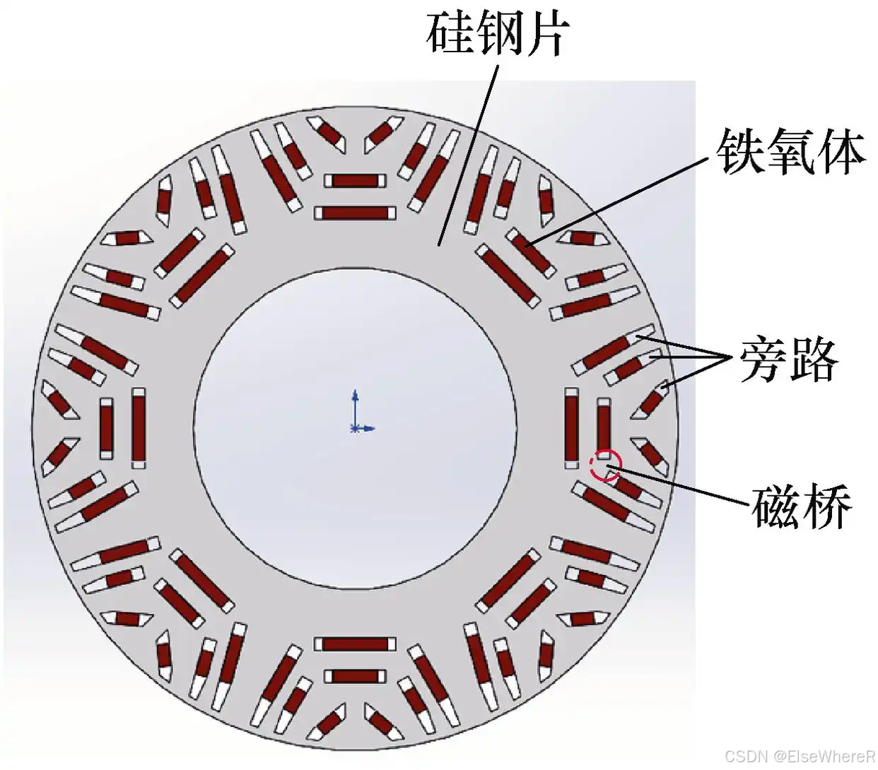 对于转子的永磁体的磁力线来说,由于d轴方向的磁力线必须穿过永磁体 + 两侧磁桥回到定子 → 阻力(磁阻)大。q 轴方向的交轴磁通主要在转子铁芯中绕过磁体横向流动,不穿永磁体主体,也不集中在薄磁桥 → 磁阻低。