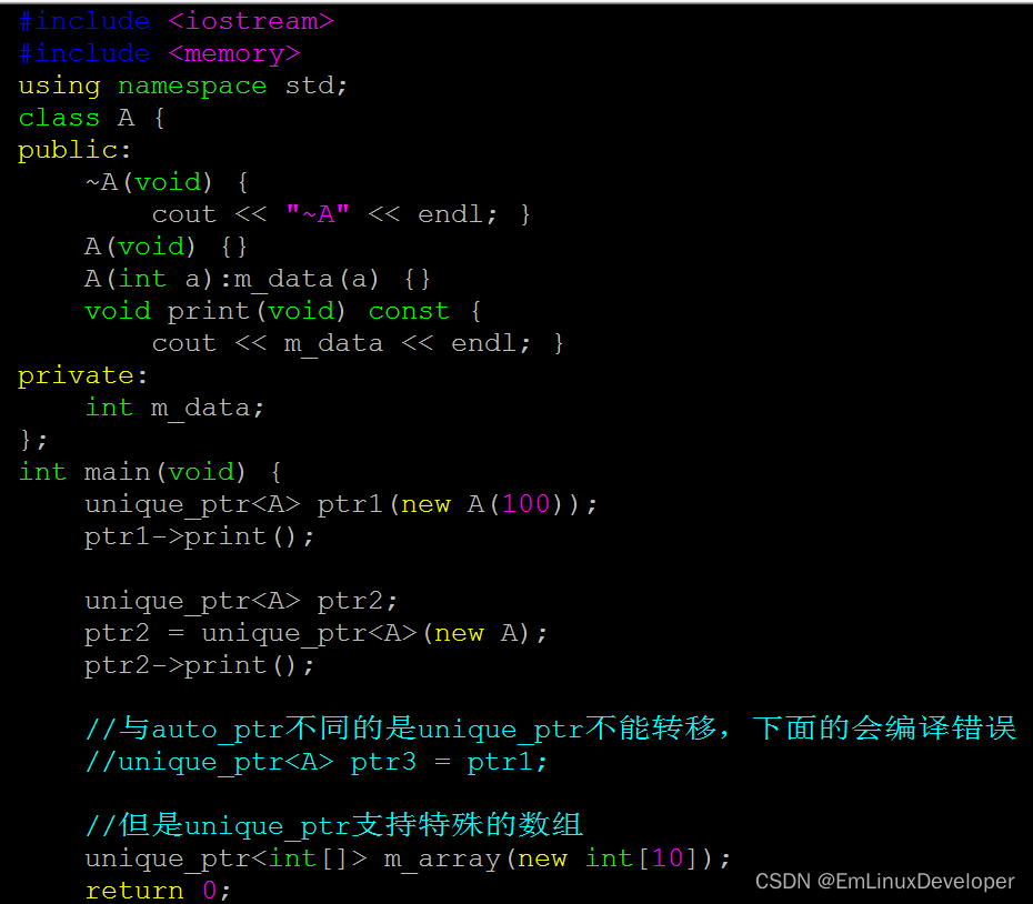 下面看看unique_ptr的用法:unique_ptr也是对auto_ptr的替换。unique_ptr遵循着独占语义。在任何时间点,资源只能唯一地被一个unique_ptr占有。当unique_ptr离开作用域,所包含的资源被释放。如果资源被其它资源重写了,之前拥有的资源将被释放。所以它保证了他所关联的资源总是能被释放。