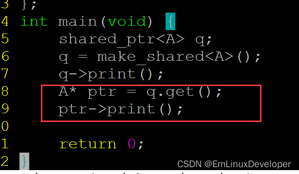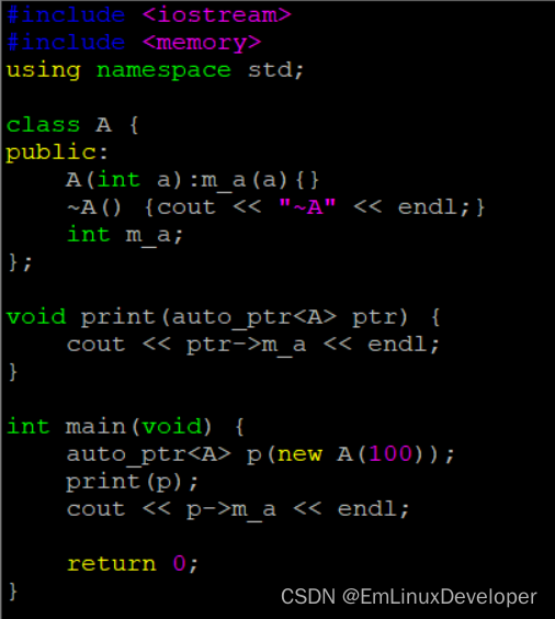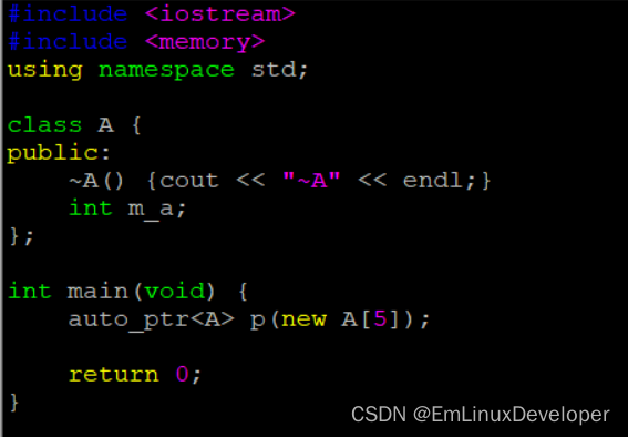 上面的代码将产生一个运行时错误。因为当auto_ptr离开作用域时,delete被默认用来释放关联的内存空间。当auto_ptr只指向一个对象时,这当然是没问题的,但是在上面的代码里,我们在堆里创建了一组对象,应该使用delete[]来释放,而不是delete.