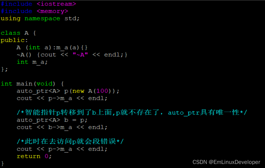 auto_ptr的一个特性就是具有唯一性,一旦一个指针转移就失去了原有的属性: