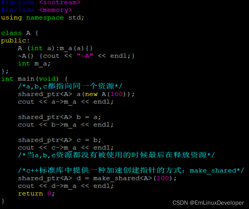 为什么要使用智能指针:我们知道c++的内存管理是让很多人头疼的事,当我们写一个new语句时,一般就会立即把delete语句直接也写了,但是我们不能避免程序还未执行到delete时就跳转了或者在函数中没有执行到最后的delete语句就返回了,如果我们不在每一个可能跳转或者返回的语句前释放资源,就会造成内存泄露。使用智能指针可以很大程度上的避免这个问题,因为智能指针就是一个类,当超出了类的作用域是,类会自动调用析构函数,析构函数会自动释放资源。