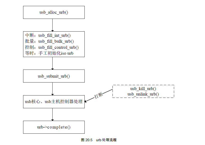 1, usb设备驱动程序创建并初始化一个访问特定usb设备特定端点的urb,并提交给usb core