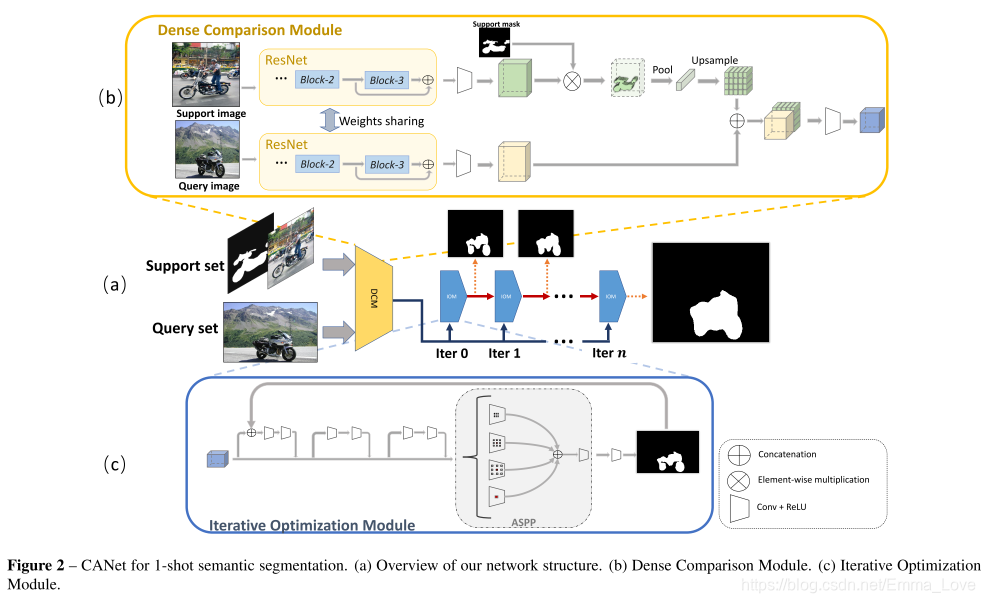 CANet由两个模块组成:密集比较模块(DCM)和迭代优化模块(IoU)。分别对应(b)和(c)。