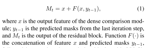 输入:除第一个IOM的输入只包含feature maps generated by dense comparison,后续IOM还将predicted masks from the last IOM 作为联合输入。