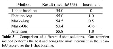 - 采用Attention Mechanism,能够有效的融合来自k-shot setting中多个support images中的信息,优于one-shot结果。
