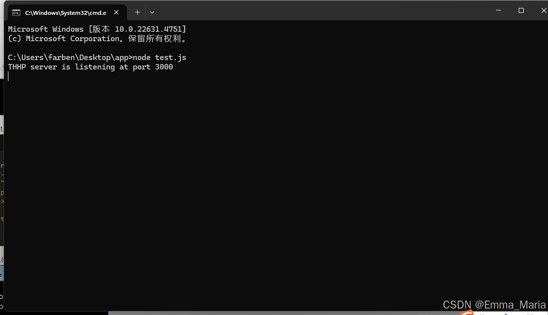 再从文件夹下地址栏点击出入cmd进入app文件夹,在命令窗口执行node test.js