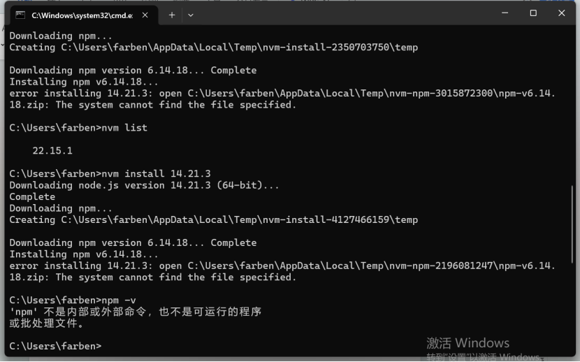 下载node14.21.3的时候报错了,原因可能是nvm版本太高,将nvm卸载,重装1.1.12即可。 在nvm的安装目录双击unins000.exe卸载nvm