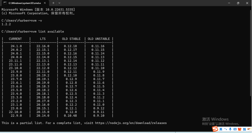 nvm list available:查看可下载的node版本