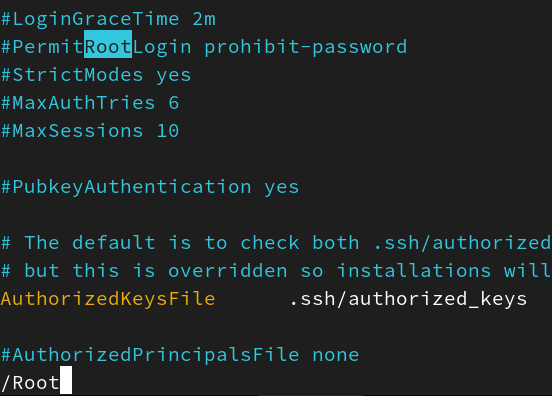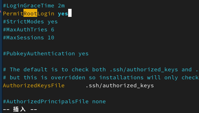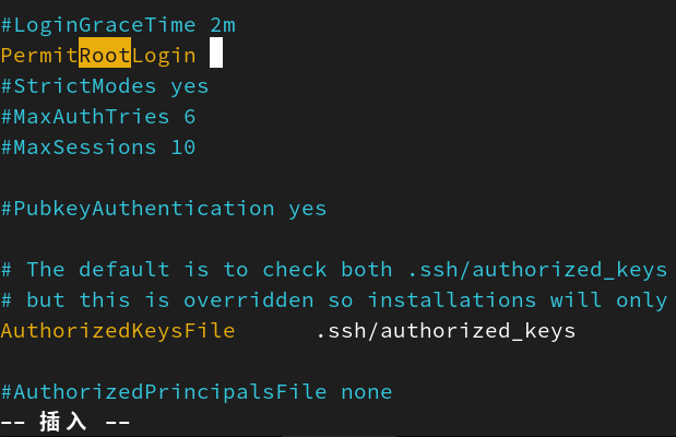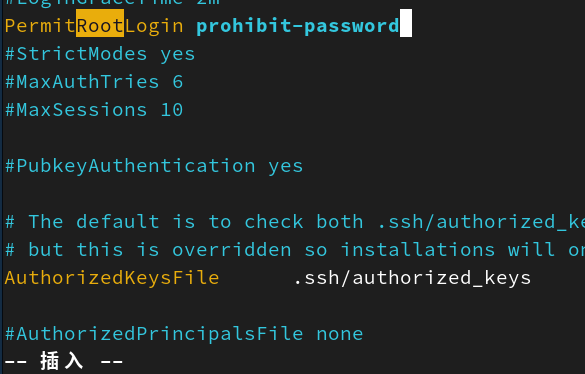 4.输入shift+4,光标会跳到最后一个字符,按下a,低端会变成插入,按下回退键(backspace)删除prohibit-password