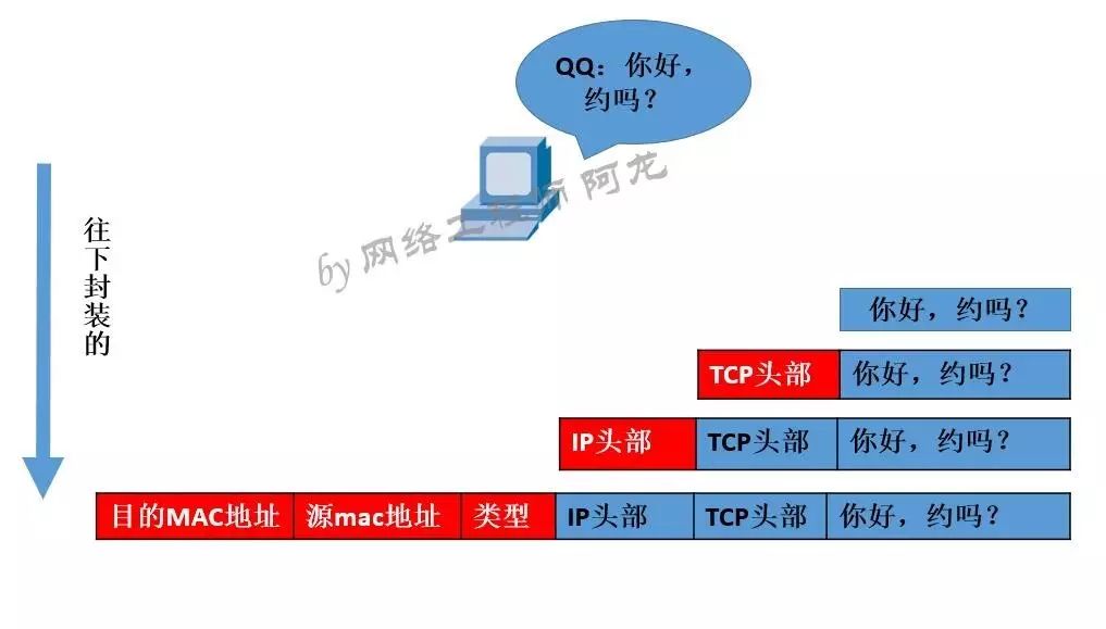 交换机的工作原理就是基于源MAC地址学习,基于目的MAC地址转发的。大家都知道网络的参考模型,我们在电脑上要发送消息时,电脑内部的处理机制是先从上层开始一层一层往下封装的。如图: