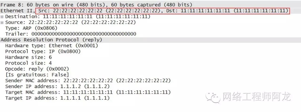 阿龙这里要提醒初学者的是,因为交换机是二层设备,只会拆包、解析到二层信息而已,不会进行更深入的解析,如网络层信息。换句话说,就是交换机根本不知道里面是什么数据,只知道这个数据包的源、目mac地址而已。