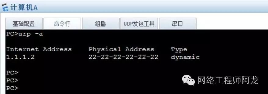这时,你就可以在计算机A看到arp缓存表了: