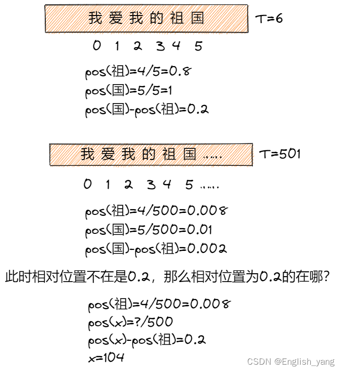 这样固然使得所有位置编码都落入[0,1]的区间内,但是问题也是显著的:在较短的文本中紧紧相邻的两个字的位置编码差异会和长文本中间隔很远的两个字的位置编码差异一致。例如: