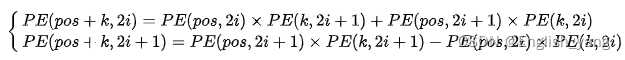 可以看出,对于pos+k位置的向量的某一维2i或者2i+1而言可以表示为pos位置和k位置向量2i和2i+1维的线性组合,这样的线性组合同样可以看作蕴含了相对位置信息。