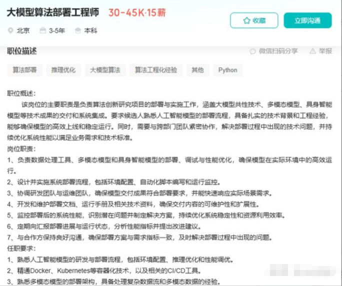 当大模型在实验室环境中训练完成后,如何将其高效、稳定地部署到生产环境,使其能够在实际业务场景中为用户提供服务,成为了大模型落地应用的关键环节。大模型部署工程师负责搭建和管理模型运行所需的基础设施,确保模型在不同硬件平台(如 CPU、GPU 集群)和软件环境(如操作系统、容器化技术)下的稳定运行。随着企业对大模型应用的需求日益增长,对具备专业部署技能的工程师需求也水涨船高。一个高效的模型部署方案不仅能提升用户体验,还能降低企业的运营成本,因此大模型部署工程师在企业的数字化转型和智能化升级中扮演着不可或缺的角色。