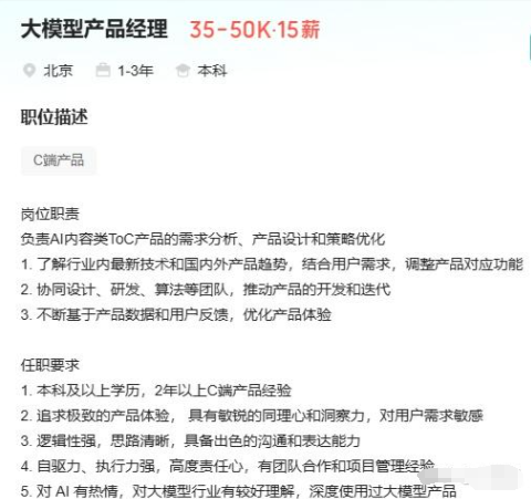 在大模型技术快速迭代和广泛应用的背景下,市场亟需既懂技术又懂业务的复合型人才,大模型产品经理正是这一需求下的关键角色。大模型产品经理需要深入理解大模型技术原理、能力边界和潜在价值,精准洞察用户和企业需求,将大模型与具体业务场景深度融合,设计出具有竞争力的产品和解决方案。以智能写作助手产品为例,产品经理要结合大模型的文本生成能力,挖掘不同用户群体(如自媒体创作者、学生、职场人士)的痛点,设计出满足多样化写作需求的功能。同时,在产品从概念到落地的过程中,产品经理还需协调技术、设计、运营等多个团队,确保产品按时上线并实现商业价值。随着大模型在各行各业的渗透,对优秀产品经理的需求不断攀升,该岗位发展前景广阔,且能在推动技术落地的过程中实现个人价值。