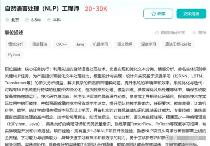 自然语言处理是大模型应用最为广泛的领域之一。如今,智能客服、机器翻译、文本生成、信息检索等技术已深度融入人们的生活与工作。随着企业数字化转型加速,对高效处理和理解人类语言的需求呈爆发式增长。以 ChatGPT 为代表的大语言模型,展现出强大的语言交互能力,大幅提升了自然语言处理任务的性能与效率,让这一领域前景更加广阔。据相关报告显示,过去几年 NLP 市场规模持续保持两位数增长,预计未来几年仍将维持高速发展态势。这意味着 NLP 工程师的就业机会将持续增加,职业发展空间十分可观。