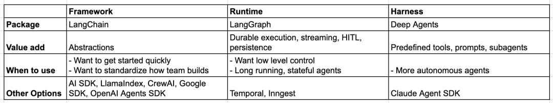 简单概括,“LangChain = build, LangGraph = run, harness = deploy + monitor + scale”。