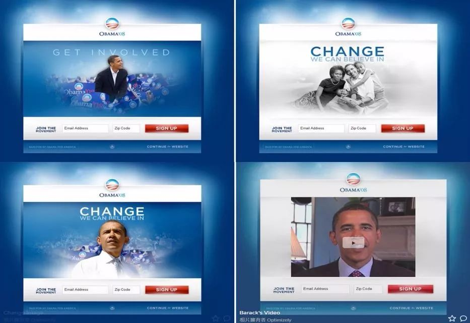 因此,他的竞选宣传团队决定采用A/B测试,试行16种页面方案: