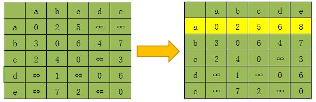 对于第一行,依次计算ab,ac,ad,ae的距离是否有第三个节点进行替换,对于ab计算发现,ab<ac+cb&&ab<ad+db&&ab<ae+eb,所以ab不用更新,同理ac也不用更新,对于ad,计算得到ab+bd=6,ac+cd=∞,ae+ed=∞,于是更新ad=6,同理计算更新ae=8;然后依次计算下面几行。全部遍历完,经历了三层循环,算法复杂度是O(n³)。pg使用该算法能够得到最优执行计划,但是在表的个数很多时计算代价所付出的代价也很大。