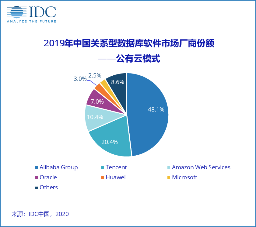 疫情已从根本上改变了消费行为和企业运营方式,数字化是大势所趋。数据库作为贯穿云计算IaaS、PaaS、SaaS三层的基础设施,云数据库服务将支撑更丰富的业务场景。IDC的《2019年下半年中国关系型数据库软件市场跟踪报告》显示,在云数据库市场中,阿里巴巴集团(含蚂蚁金服数据库业务收入)以48.1%的市场份额排名第一,腾讯以20.4%排名第二,AWS以10.4%排名第三,Oracle以7.0%位居第四,而华为则是后发而来,斩获3.0%的云数据库份额位列第五(参见:《IDC发布2019年下半年中国关系型数据库软件市场跟踪报告》)。