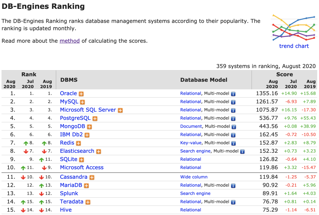 注意观察北京时间8月1日晚更新的8月号DB-Engines数据库流行度排行可以发现:相较上个月的排名,Redis继续稳步上升,在本月以0.55分之多超越Elasticsearch来到第7位;Microsoft Access则以0.02分的微弱优势顶替掉Cassandra,重回Top 10;不过最值得关注的,当属Oracle和Microsoft SQL Server一改前两个月的颓势,本月得分均明显上涨,分别增长1.11%和1.52%,这或许就是得益于基于云的不断发展。