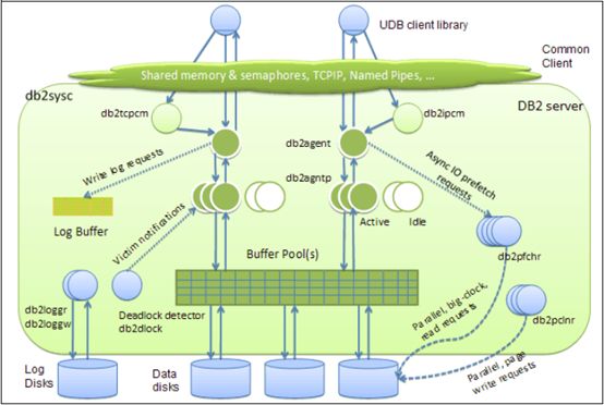 是一个C/S结构,客户端可以通过TCP/IP或IPC协议与服务器通信,每当客户端与服务器建立连接之后,会在服务器端产生一个代理线程(db2agent)负责处理来自客户端的所有请求,但是当某一时刻并发请求很多或者连接断开时,重复地产生与销毁代理线程会产生很大的系统开销,所以DB2服务器在启动时创建一个常连接池来避免重复地创建/销毁代理线程。