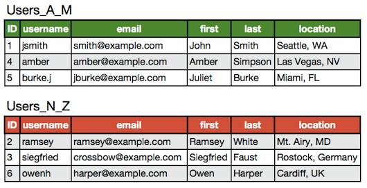 实际情况中往往会是垂直拆分和水平拆分的结合,即将 Users_A_M 和 Users_N_Z 再拆成 Users 和 UserExtras,这样一共四张表。