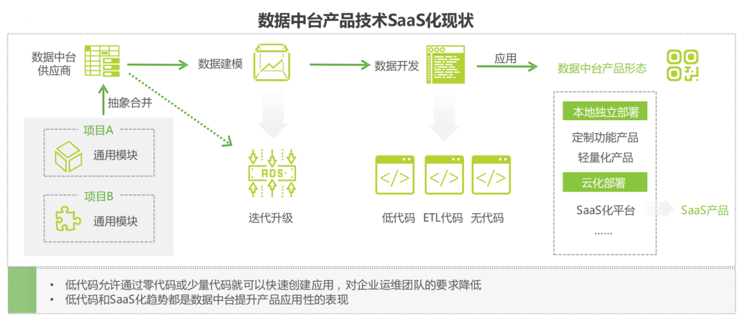 从内部来看,数据中台不断沉淀跨行业、跨企业复用的组件、模块,存在朝SaaS和本地部署混合模式发展的趋势。从外部来看,随着云计算的普及,部分系统SaaS化趋势较强。因此,作为前台和后台的连接,数据中台与SaaS应用融合对接的 实践越来越多,市场将逐渐形成一套成熟的中台+SaaS系统融合闭环方案。