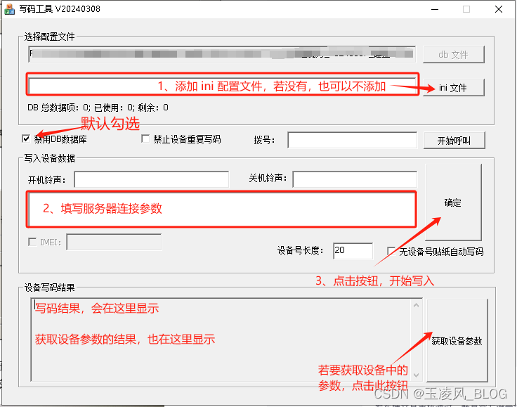 6、“获取设备参数”:将设备中的参数读取出来,包括设备SN号,版本信息,流量卡信息等。