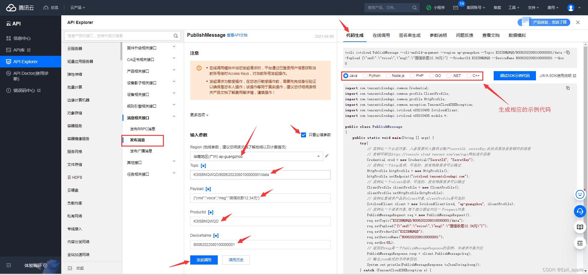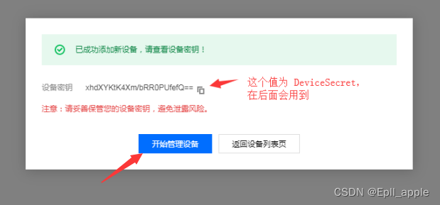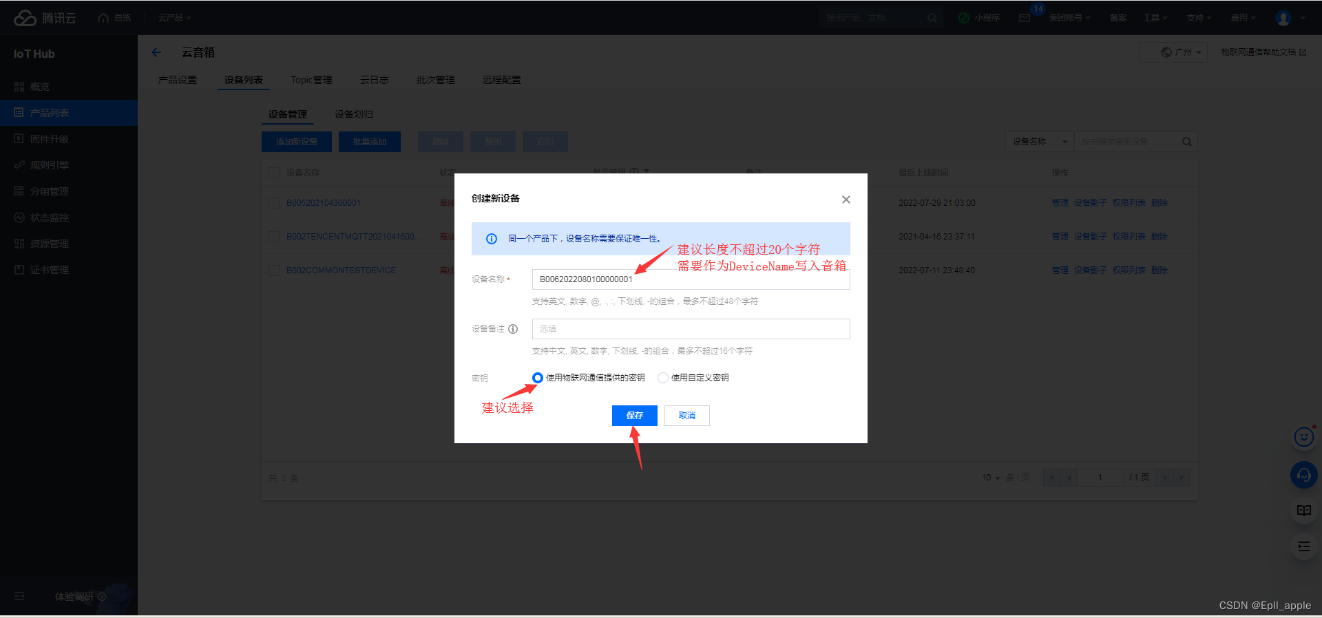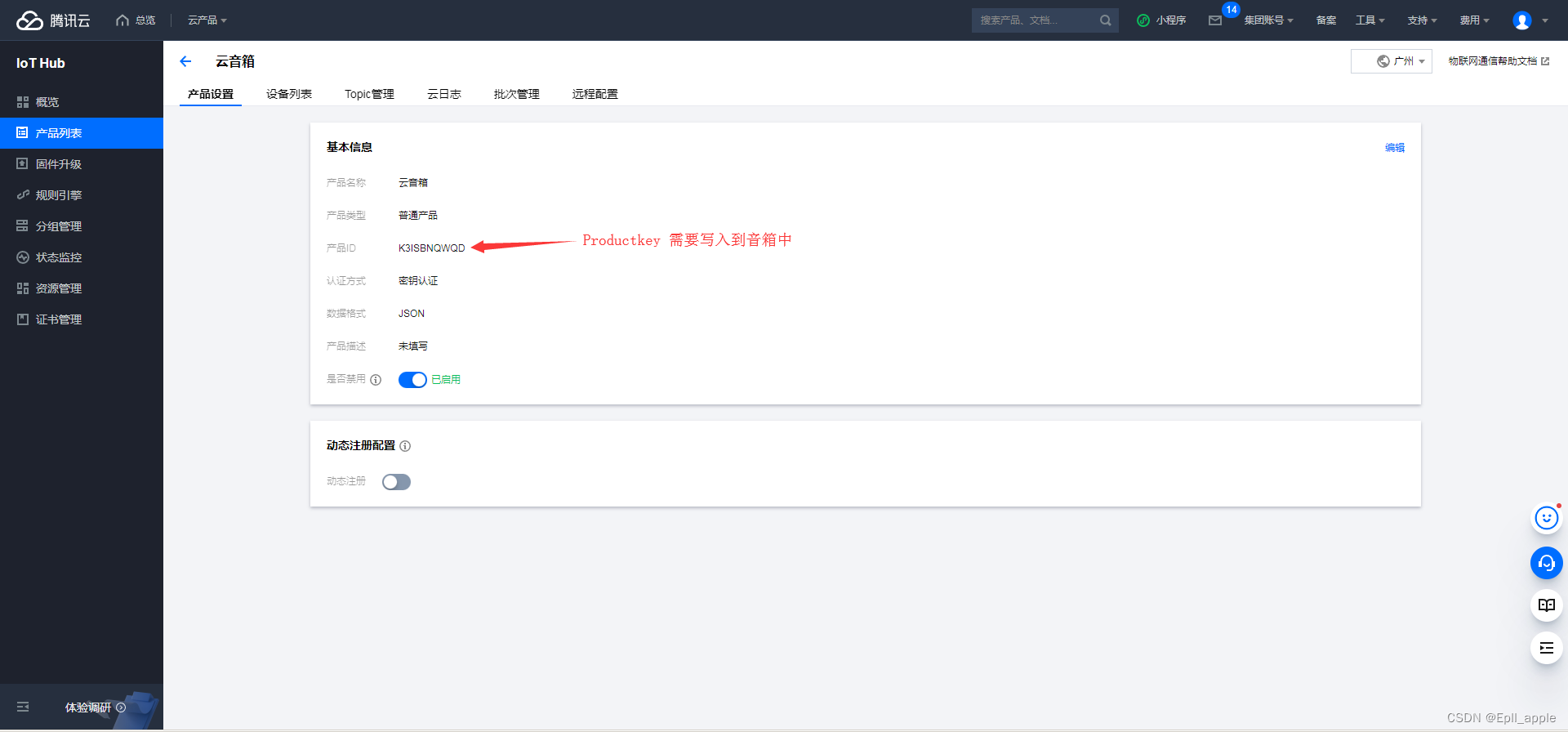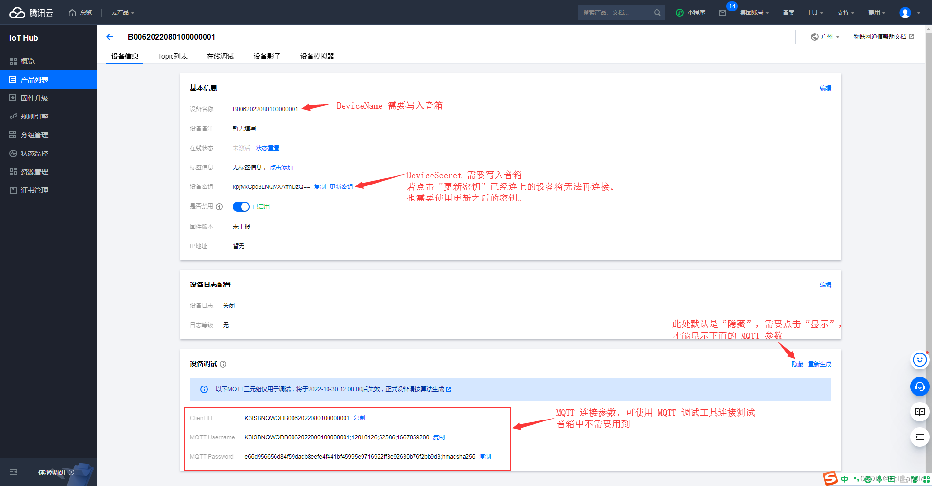 腾讯云物联网MQTT写入到音箱中的参数有:产品ID(ProductKey),设备名称(DeviceName),设备密钥(DeviceSecret)