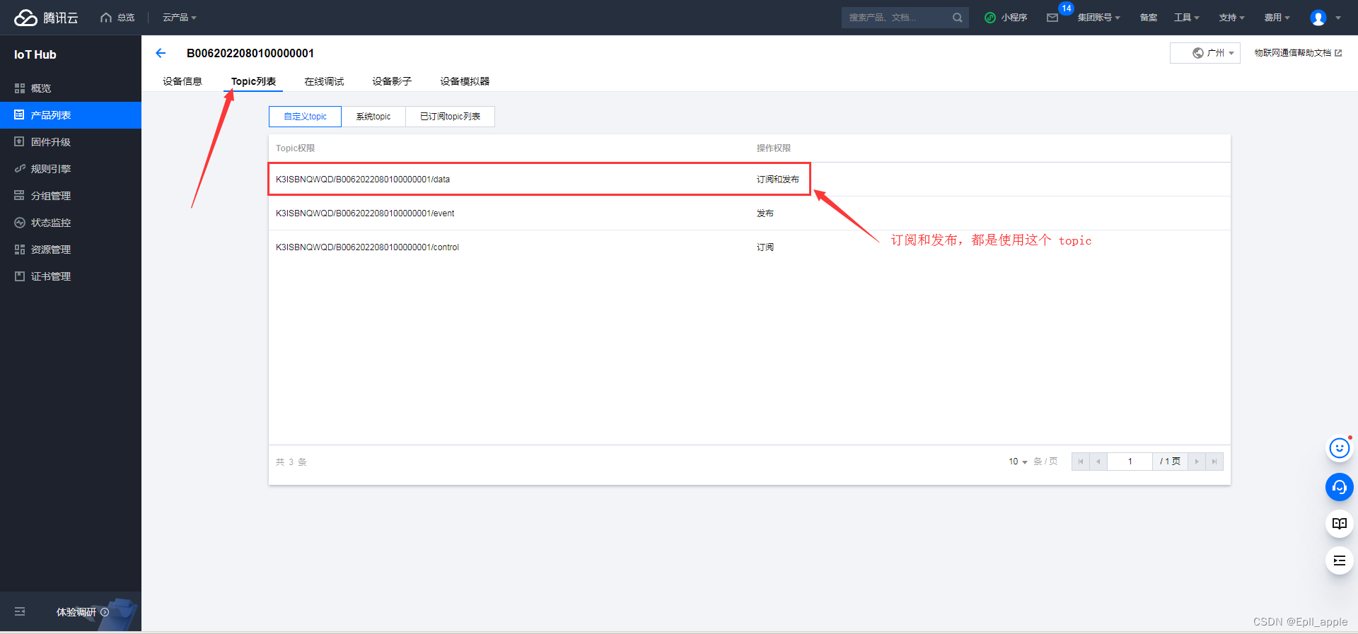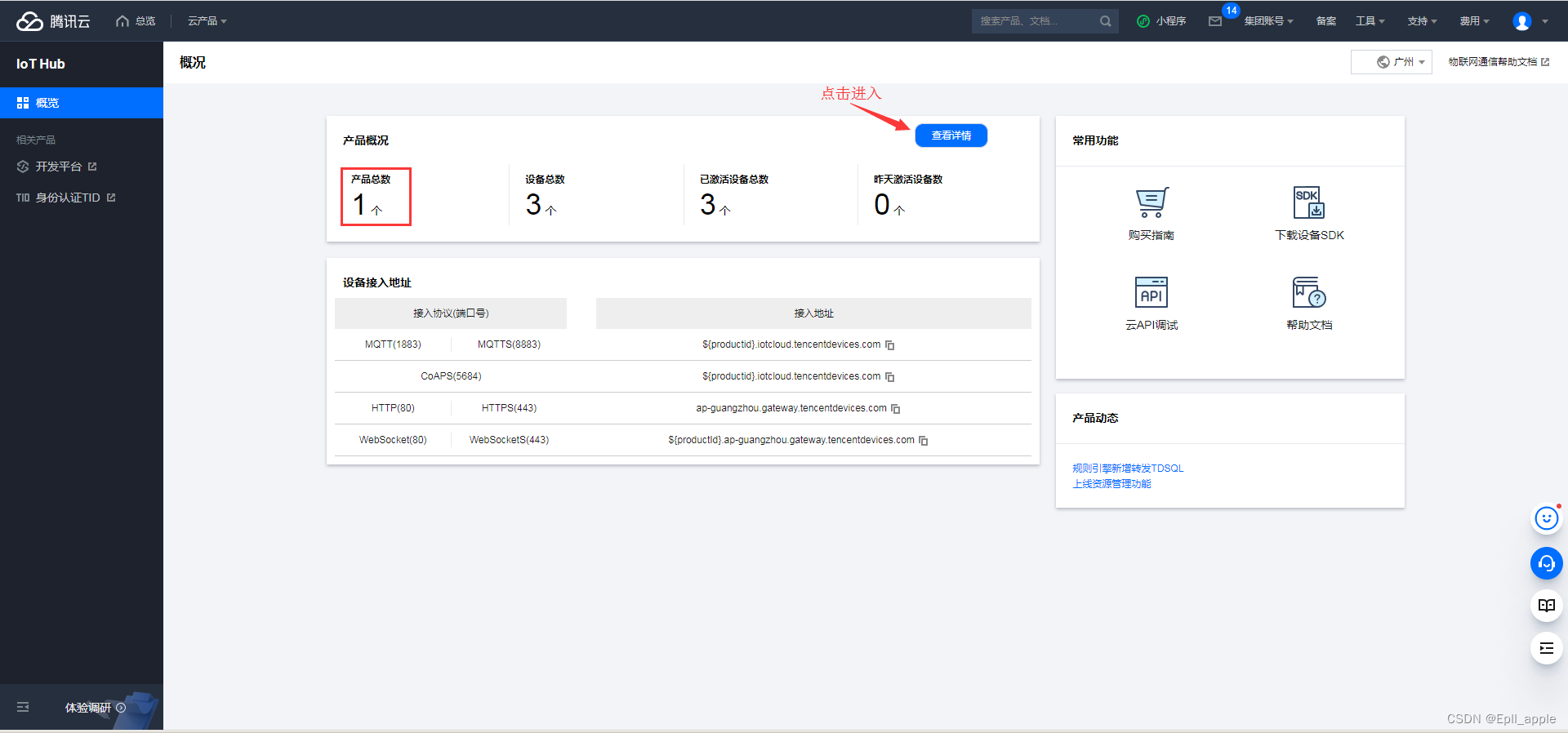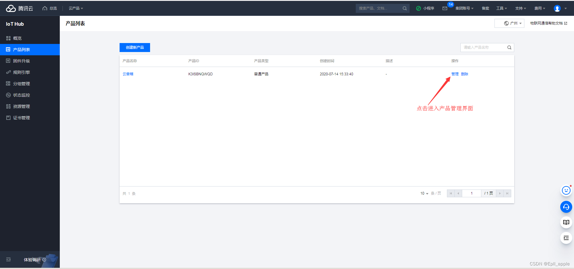 一、登录腾讯云物联网通信控制台: https://console.cloud.tencent.com/iothub