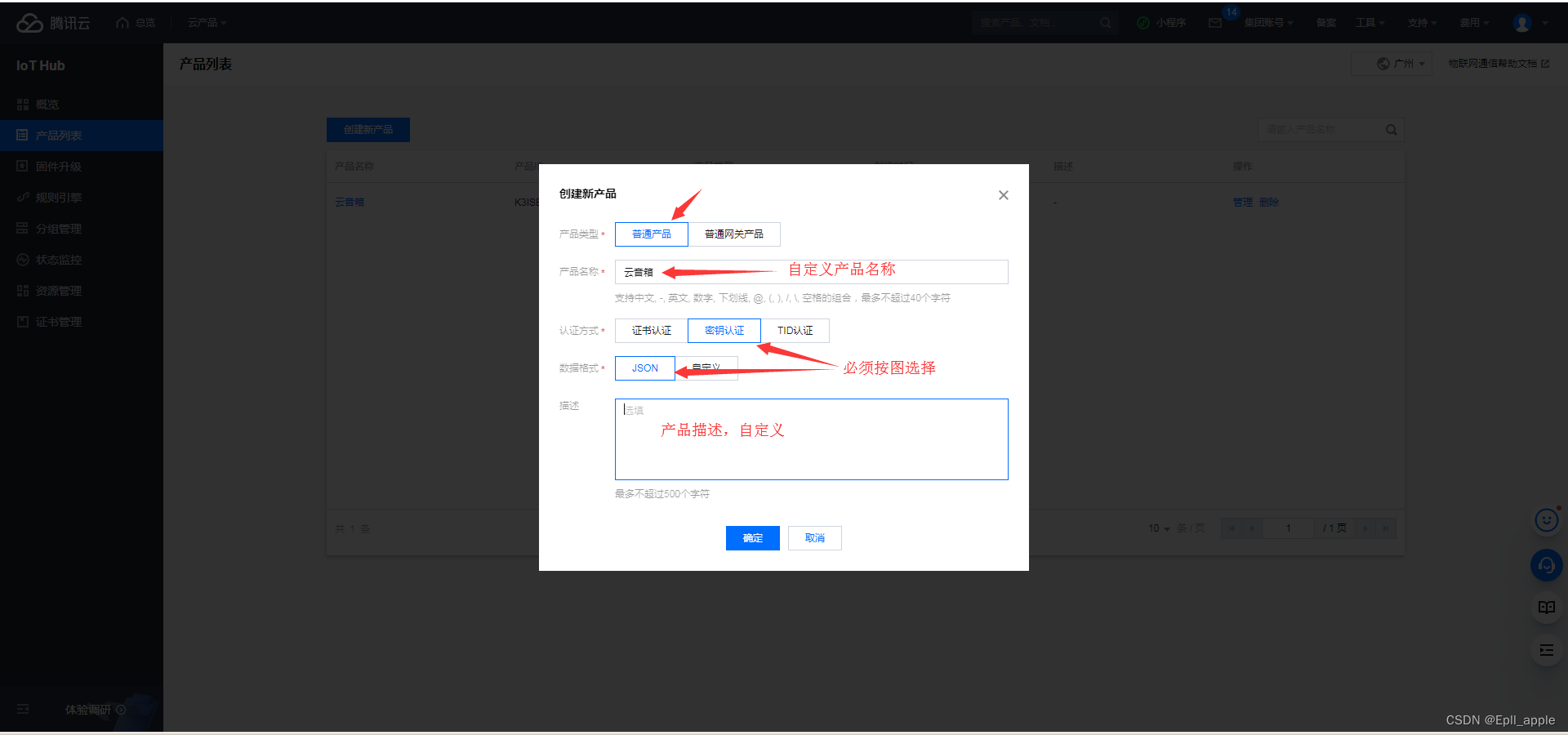 二、选择“产品列表”-“创建产品”按照下图所示填写,然后点击“确定”