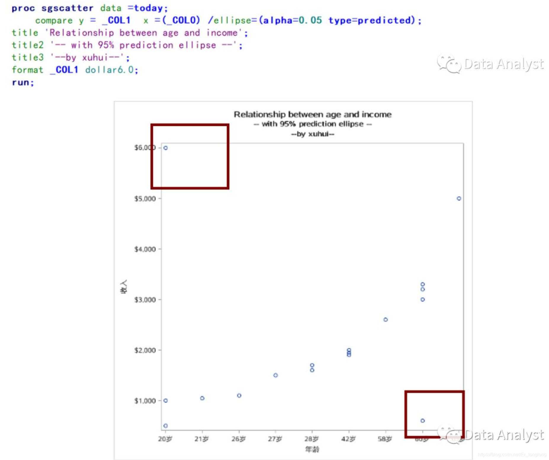 一般收入随年龄的增长呈现类线性趋势,如果出现下图情况,即低龄高收入者(如思聪)、高龄低收入者(如流浪老人),虽也可能属于正常情况,但还是要将其排除在建模样本外。如下为实现该散点图的SAS代码: