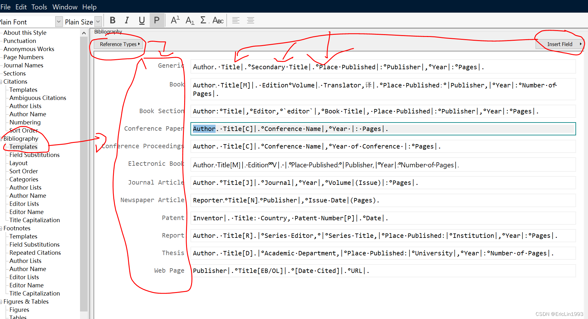 4、Bibliography 的Templates的设置就相对复杂,也是重点。首先要明确Reference Types 和Field的概念。Reference Types也就是确定你这条参考文献是期刊(journal)、图书(book)、还是会议论文(conference paper)等。Field就是参考文献列出来的部分,Author就是作者,Tile就是名字等。通过确定Reference Types和Field的排列,就可以确定参考文献列出来的格式了。这里的难点就是看不懂(或者说不是很清楚)里面格式,比如里面的|和上标。是干什么用的。