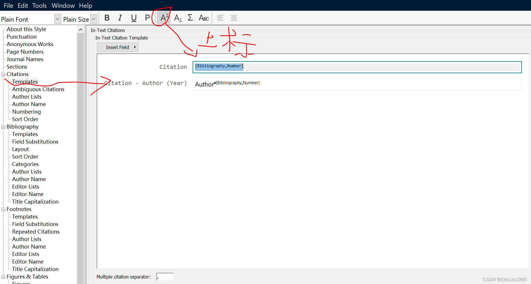 3、点击各自的Templates(模板)进行设置,citation相对简单。设置 [Bibliography Number],正文就会出现[1],[2]等。设置(Bibliography Number)就会出现(1),(2)等。还可以点击上面的设置设置把字体格式上标(常见的作法)。