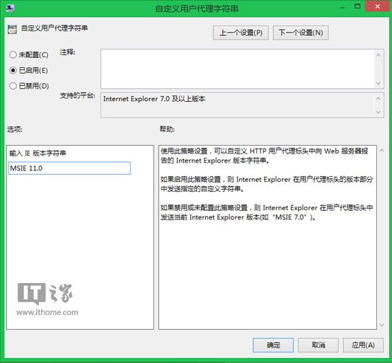 这里选择已启用,然后在输入IE版本字符串里面输入你需要的IE内核版本