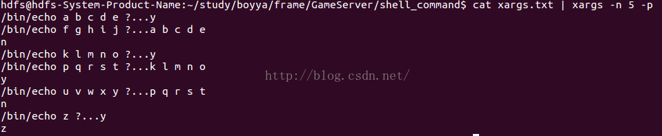 cat xargs.txt | xargs -n 5 -p