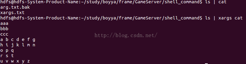 #使用xargs将ls的结果作为cat的参数,ls的结果为文件名,所以cat 文件名即查看文件内容 -