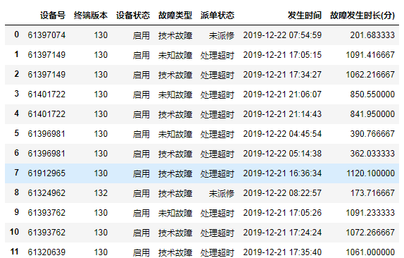 8data['故障发生时长(分)'] = delta.dt.days*1440 + delta.dt.seconds/60