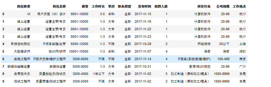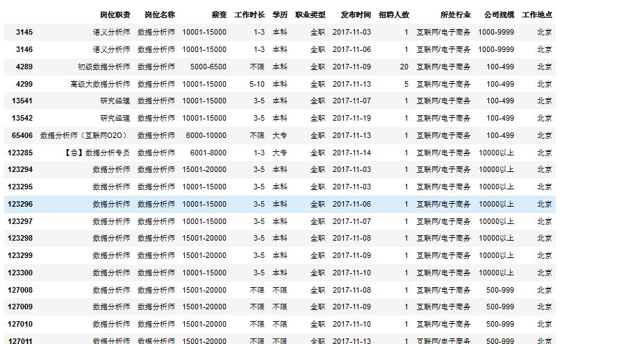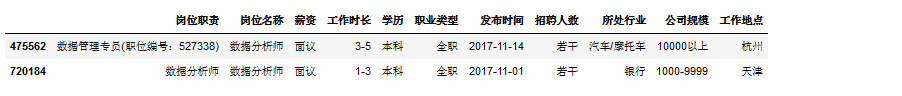 # resultIndex(['岗位职责', '岗位名称', '薪资', '工作时长', '学历', '职业类型', '发布时间', '招聘人数', '所处行业', '公司规模', '工作地点'], dtype='object')
