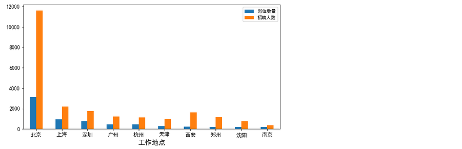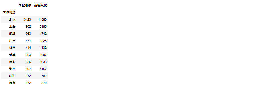 grb = data_da.groupby(['工作地点']).agg({'岗位名称':'count','招聘人数':sum}).sort_values(by = '岗位名称',ascending = False).head(10)
