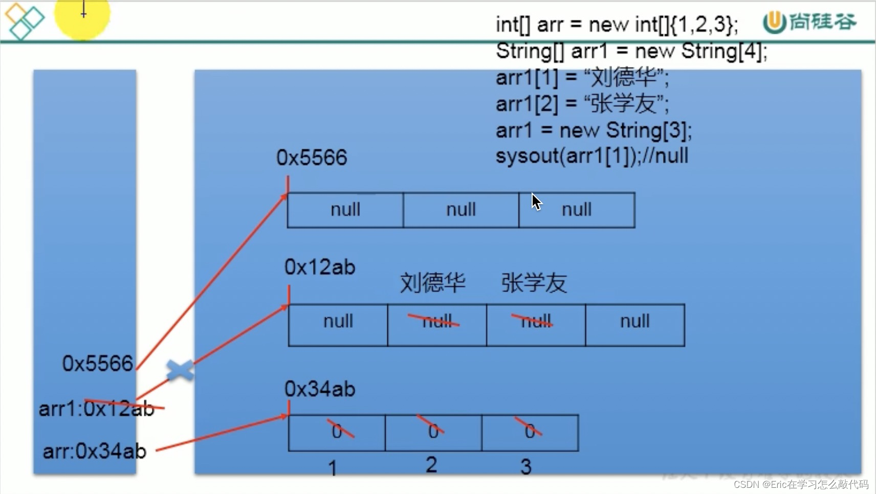 2、引用数据类型:数组元素是引用数据类型——默认初始化值是null,即空值