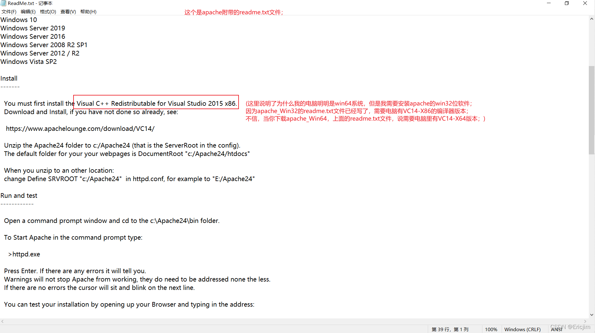 注:有人说为什么我的电脑是Win64位系统,却要安装apache-Win32位。可以自己参考readme.txt文件就知道了;